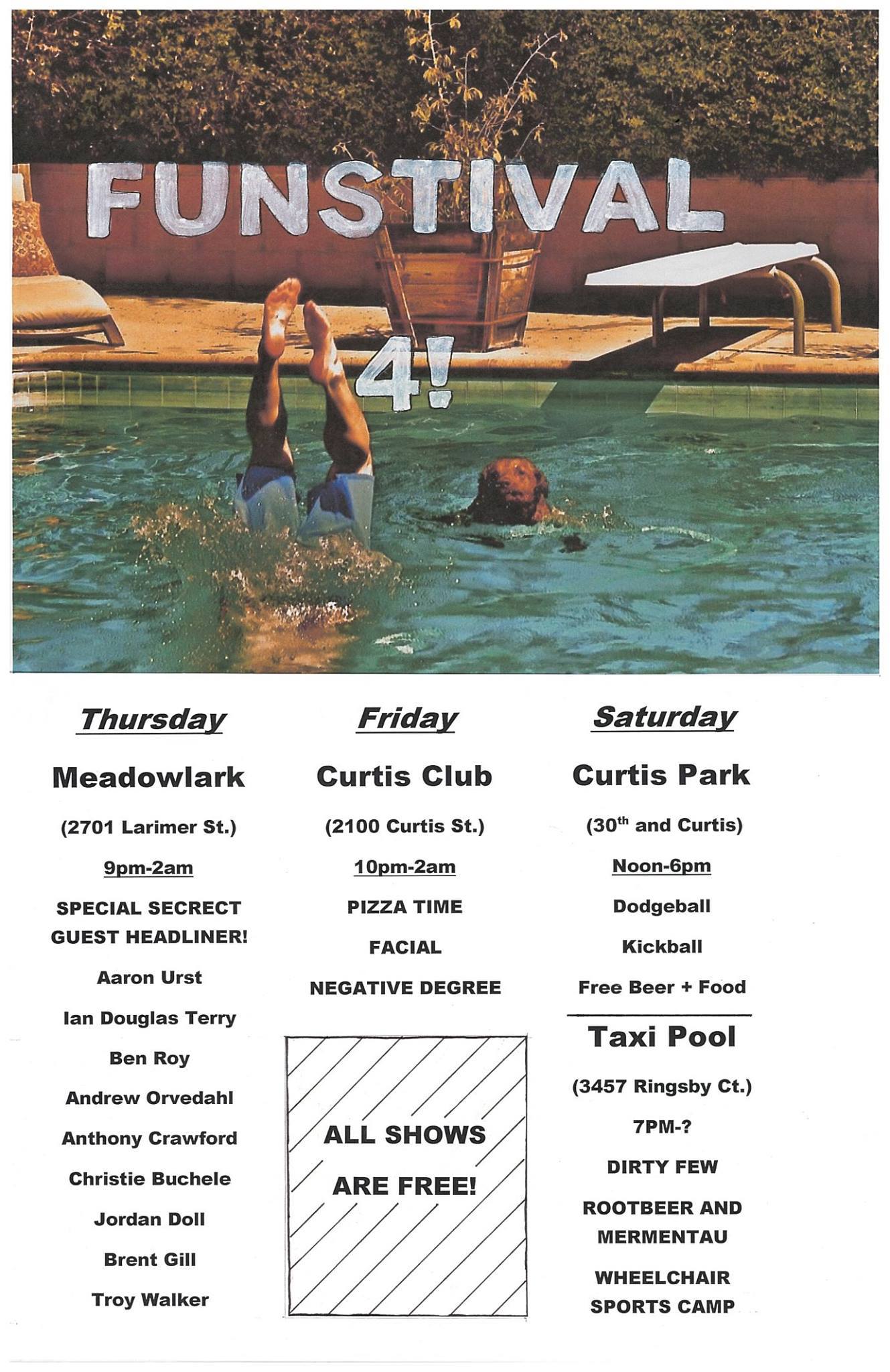 The FREE party continues tonight with a last-minute switcheroo! Tonight, The Fine Gentleman’s Club will be presenting the first-ever Denver Comedy Funderdome. Teams of comics will compete for glory against the FGC in events that test both body and spirit! With a special Comics Against Civility segment hosted by Zac Maas and Jake Browne! Dance party to follow!